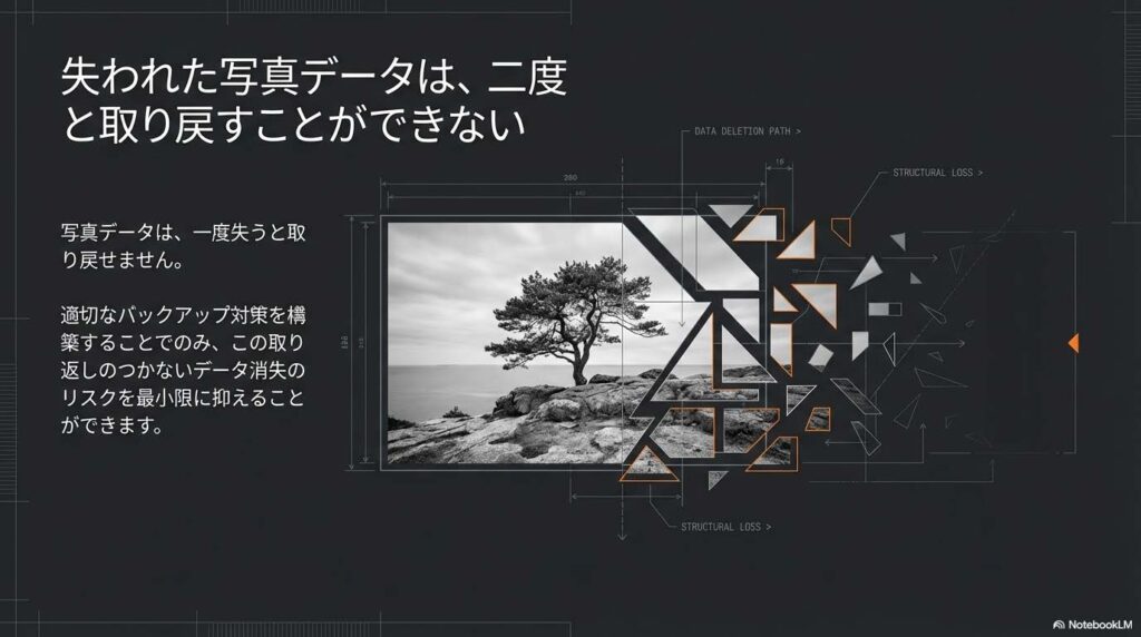 - 写真データは一度失われると二度と取り戻すことができないため、適切な対策が必要です。バックアップを行うことで、機器の故障や人為的なミスによるデータ消失のリスクを最小限に抑えることができます。