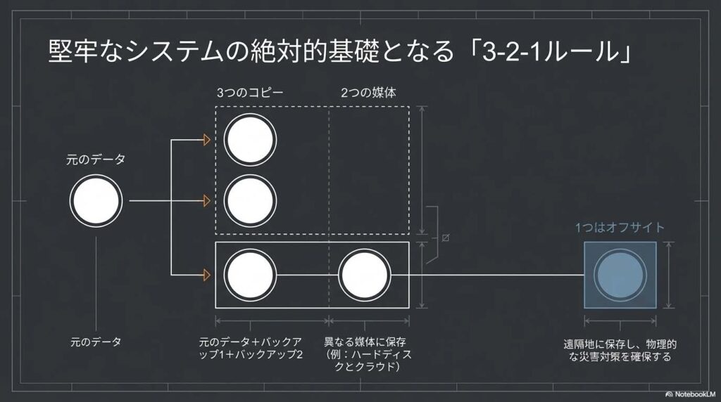 データ管理のプロフェッショナルが絶対の信頼を寄せるのが「3-2-1ルール」です。これは単なる習慣ではなく、統計的なリスク分散に基づいたデータ保護の最適解です。