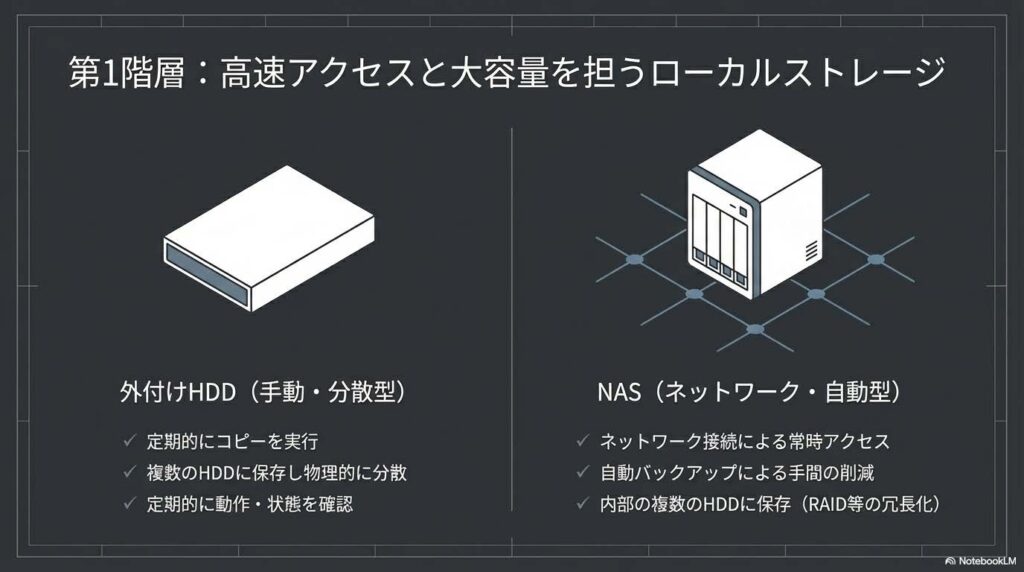 理想的な保存インフラは、性質の異なる3つのレイヤーを組み合わせることで完成します。それぞれの特性を理解し、自動と手動のワークフローを使い分けることが肝要です。