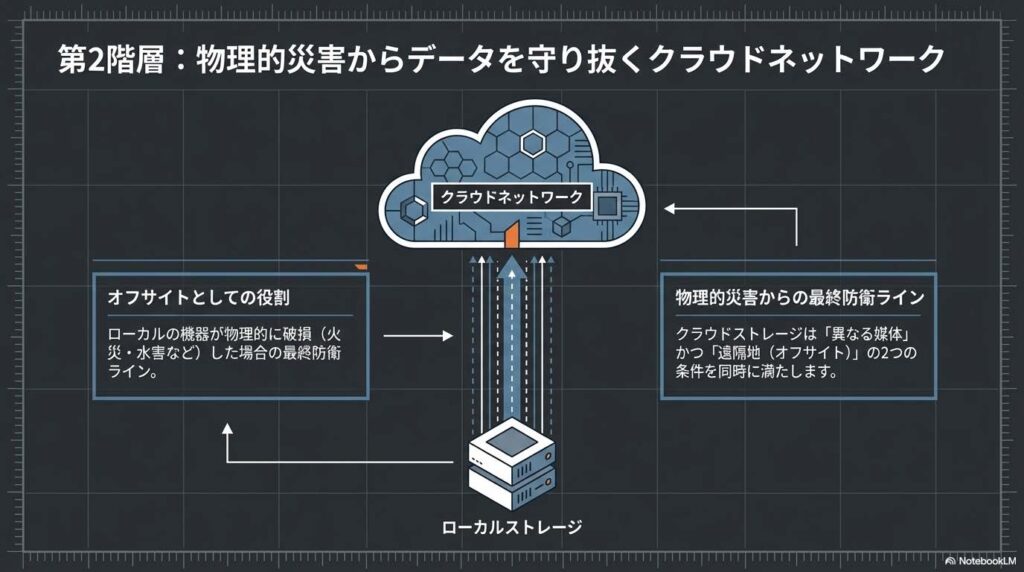 | 1つはオフサイト | 1つのコピーは、自宅以外の**「遠隔地」**(クラウド等)に保存する。 | 万が一、火災や地震などの災害で自宅の機器がすべて壊れても、物理的に離れた場所にあるデータだけは守り抜けるからです。 |