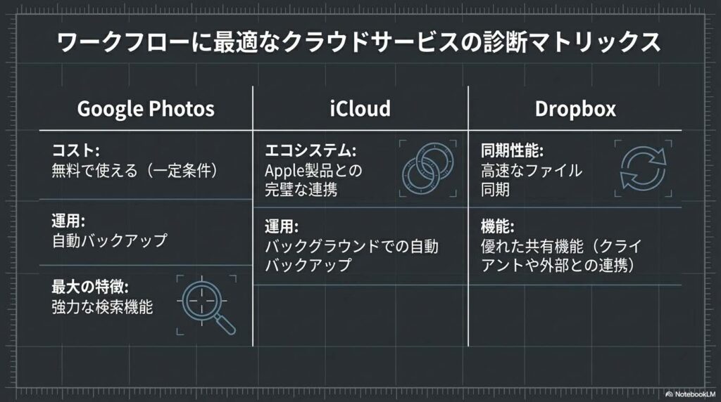 - Google Photos / iCloud: 強力な検索性とエコシステム連携を誇り、スマホ写真のリアルタイム同期(自動バックアップ)に最適です。