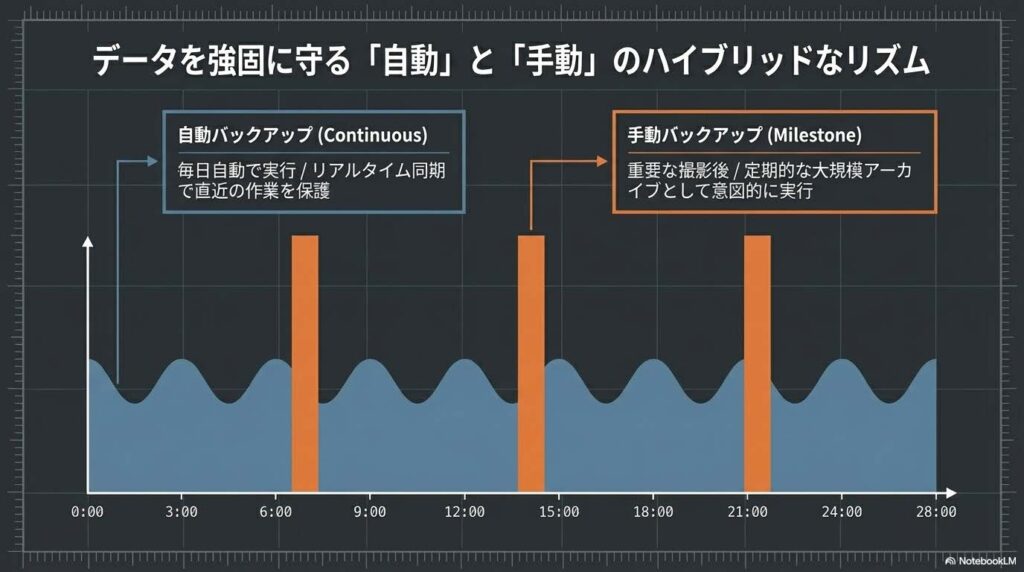 - バックアップを習慣化・自動化する 基本は**「毎日自動」で行われる設定にします。手動の場合は、旅行や結婚式など、二度と撮れない「重要な撮影の直後」**にすぐコピーを取る癖をつけましょう。