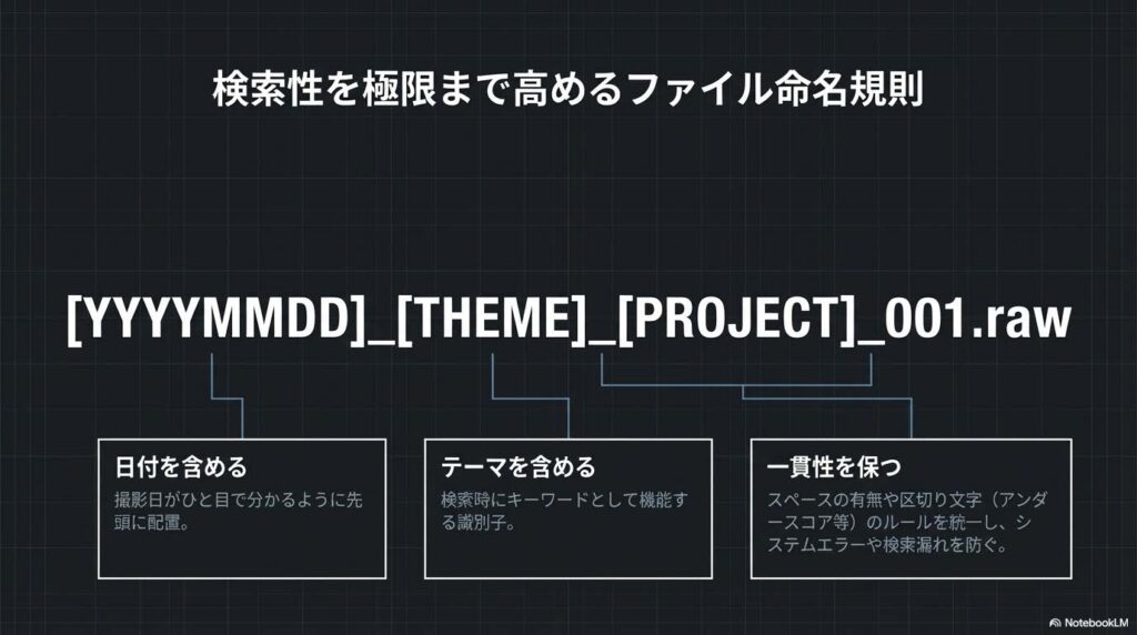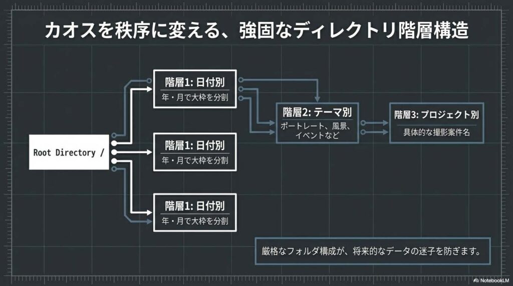 - 一貫性のあるフォルダ構成: 「日付別」だけでなく「テーマ別」「プロジェクト別」の階層を組み合わせ、直感的なアクセスを実現します。