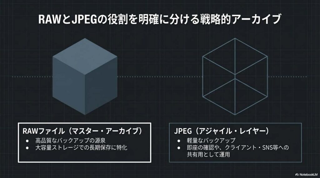 - JPEG(アクセス・インターフェース): 共有や閲覧に最適化された軽量データです。こちらはクラウド同期をメインとし、利便性を優先した管理で十分です。