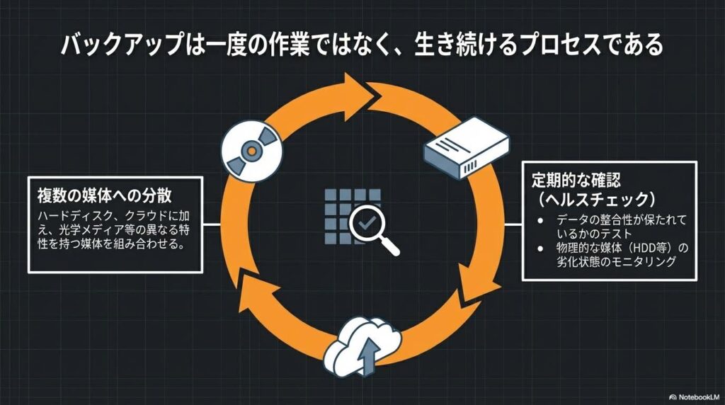 - 定期的にデータの整合性を確認することと、保存媒体そのものの状態に異常がないかを確認することが不可欠です。複数の媒体(HDD、クラウド、光学メディア)を組み合わせることも有効です。