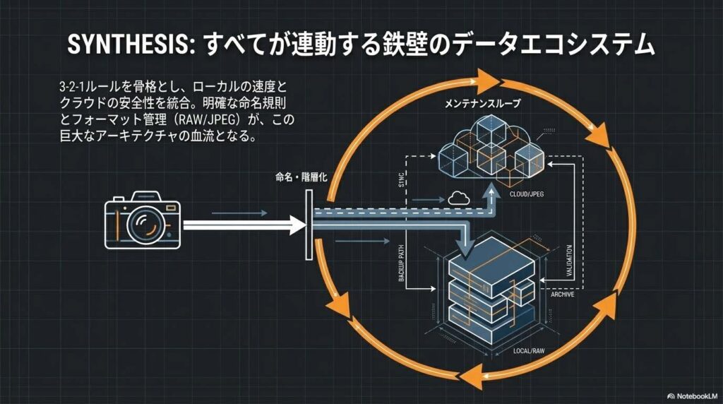 シャッターを切ることで生まれた一瞬の輝きを、未来へと届ける責任。それがバックアップという名の「撮影の続き」です。データの整合性チェックや媒体の定期的な健康診断をルーティンに組み込むことで、初めてあなたのデジタル遺産は永続性を獲得します。