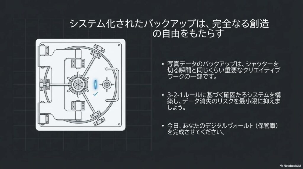 写真データのバックアップは、シャッターを押す行為と同じくらい、愛情深いクリエイティブな作業です。「3-2-1ルール」を実践することで、あなたは大切な思い出を一生守り抜く「守り人」になれます。