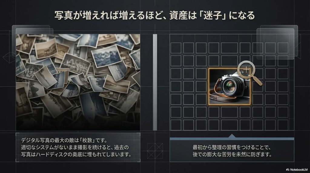 デジタルカメラやスマートフォンの普及により、私たちは日常のあらゆる瞬間を記録できるようになりました。しかし、その手軽さと引き換えに、膨大なデータの中に大切な思い出が埋没してしまう「デジタル・デブリ(塵)」の問題に直面しています。「あの写真、どこにあるっけ?」という探索時間は、本来享受すべき思い出の価値を損なう損失に他なりません。
