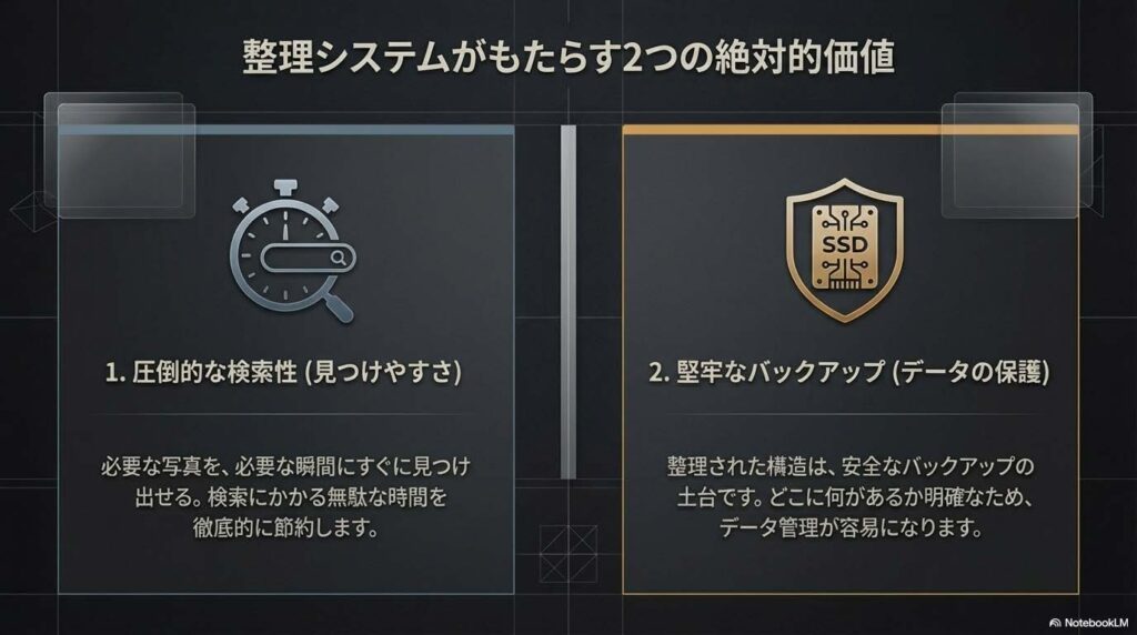 - 回答: 主な目的は「見つけやすくすること」と「バックアップの容易化」です。必要な写真をすぐに見つけられることで時間を節約でき、整理されていることでデータのバックアップや管理がスムーズになります。
