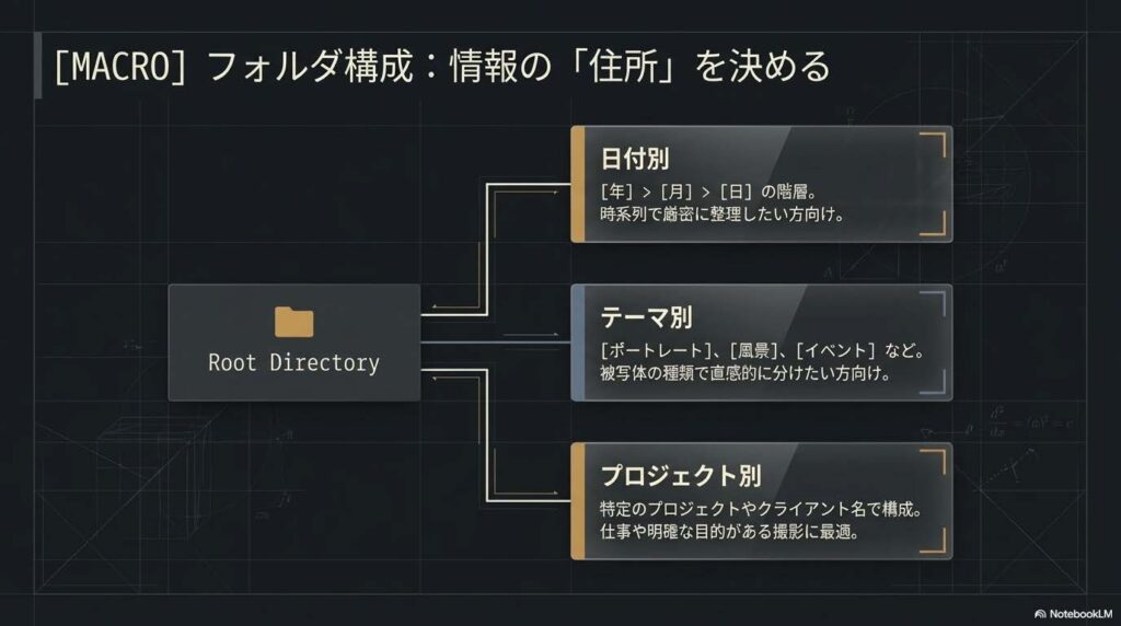 整理とは、単なる「片付け」ではなく、未来の自分が写真を楽しむための**「価値ある投資」**なのです。では、具体的にどのようにデータを分けていけばよいのか、その構成案を見ていきましょう。