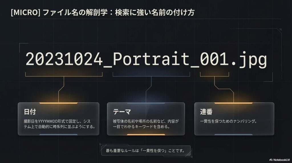 写真管理の最小単位であり、最も強固な基盤となるのが「ファイル命名規則」の確立です。特定の管理ソフトに依存せず、OS標準の検索機能でも瞬時に目的のファイルへ到達するためには、一貫した論理構造が不可欠です。