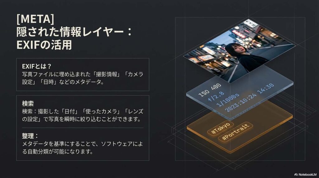 手作業によるフォルダ分けには、物理的・時間的な限界が伴います。この限界を突破し、管理を「静的な作業」から「動的な自動処理」へと変えるのが、写真に埋め込まれたメタデータ「EXIF(イグジフ)」の活用です。