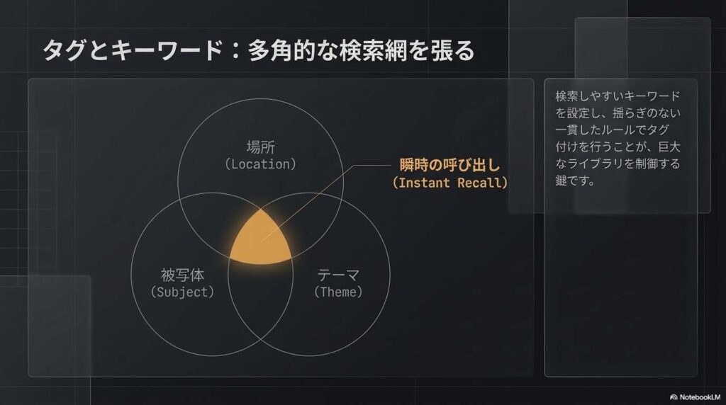 これらに加え、検索をさらに容易にするため、被写体や場所(Subject/Place)を反映した「タグ」や「キーワード」を一貫して付与することが、検索性を最大化する鍵となります。