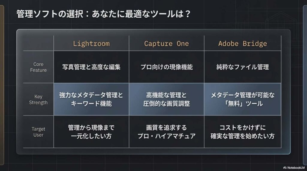 - 最適: 大量のライブラリを保有し、管理から現像までを一元化したいユーザー。