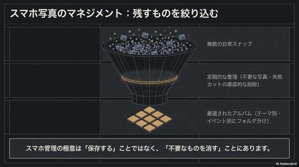 - 回答: アルバム機能を利用してテーマ別にフォルダ分けすることと、不要な写真を定期的に削除する整理の習慣を持つことです。