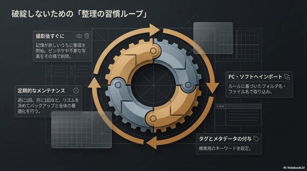 プロの現場でも、初心者の趣味の時間でも、最も大切なのは「シャッターを切った後の習慣」です。せっかく撮った素晴らしい写真も、ハードディスクの奥底で迷子になってしまっては、その価値を半分も発揮できません。