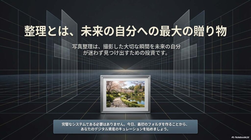 写真整理は、未来の自分へ贈る最高のプレゼントです。膨大な「データの塊」を抱えるのではなく、厳選された「最高の瞬間」を整理して残すことで、写真は初めてあなたの財産になります。