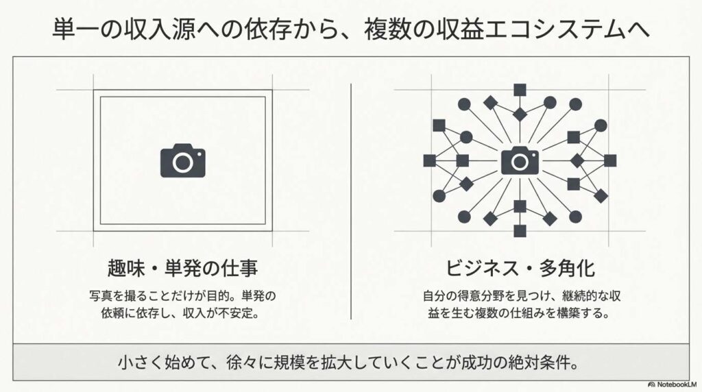 現代のフォトグラファーに求められるのは、単に美しい瞬間を切り取る技術だけではなく、その技術をどう「多角的な収益源(レベニューストリーム)」へと変換するかという戦略的思考です。写真は撮るだけでなく、売る、貸す、そして教えることができる、極めて汎用性の高いビジネス基盤となります。この記事では、あなたの「好き」を、持続可能なビジネスへと昇華させるための具体的なロードマップを提示します。