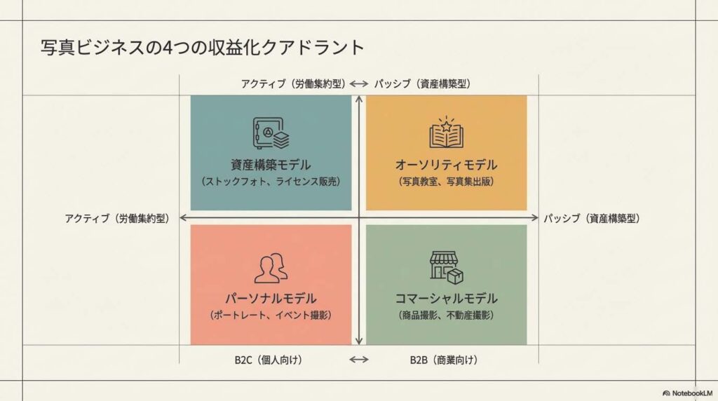 このガイドでは、写真家としてのキャリアを構築するための「学びのロードマップ」を提示します。まずは、写真市場における2つの大きな収益モデルの違いを理解することから始めましょう。