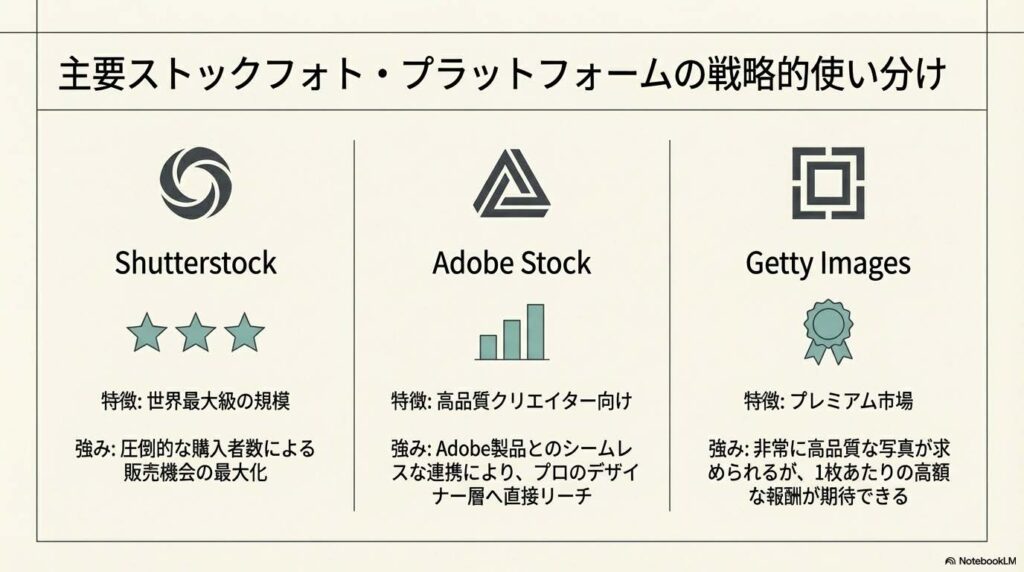 2. ストックフォト・ビジネスにおける主要な3つのプラットフォームとその特徴は何ですか? 世界最大級で多くの購入者が存在する「Shutterstock」、Adobe製品との連携が強みで高品質な写真が揃う「Adobe Stock」、そして高品質な写真を取り扱い高額な報酬が期待できる「Getty Images」の3つが挙げられます。