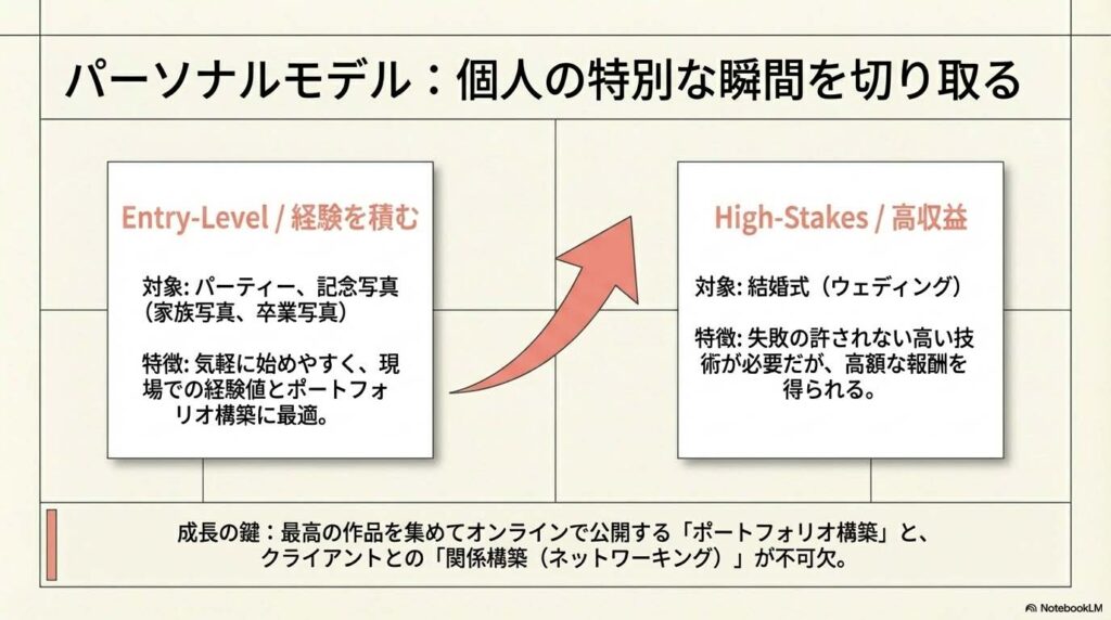 対人撮影は、写真家としての「労働単価」を最大化できる分野です。しかし、いきなり高単価な案件を獲得するのは容易ではありません。ここでは、戦略的なステップアップが必要です。