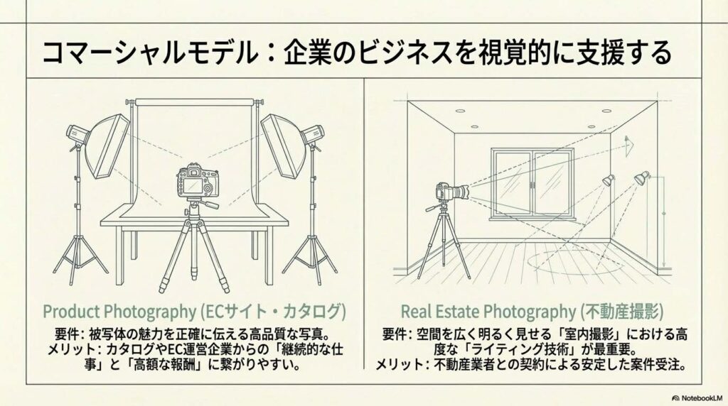 | 不動産撮影 | 住宅や建物の室内を撮影する分野。ライティング技術が重要視され、継続案件になりやすい。 |