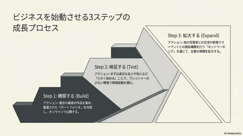 10. 写真家として実務を始める際の「実践的な3つのステップ」とは何ですか? まず作品を集めてオンラインで公開する「ポートフォリオの作成」、次に身近な人から依頼を受けて経験を積む「小さく始める」、そして他の写真家やクライアントとの関係を築く「ネットワーキング」の3段階です。