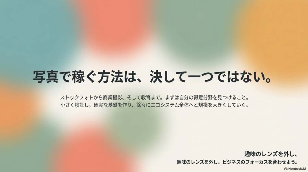 写真で稼ぐ道は、決して一つではありません。ストックフォトで着実に資産を築く道もあれば、受託撮影で人の感動に直接触れる道、あるいは知識を伝えて教育者として歩む道もあります。